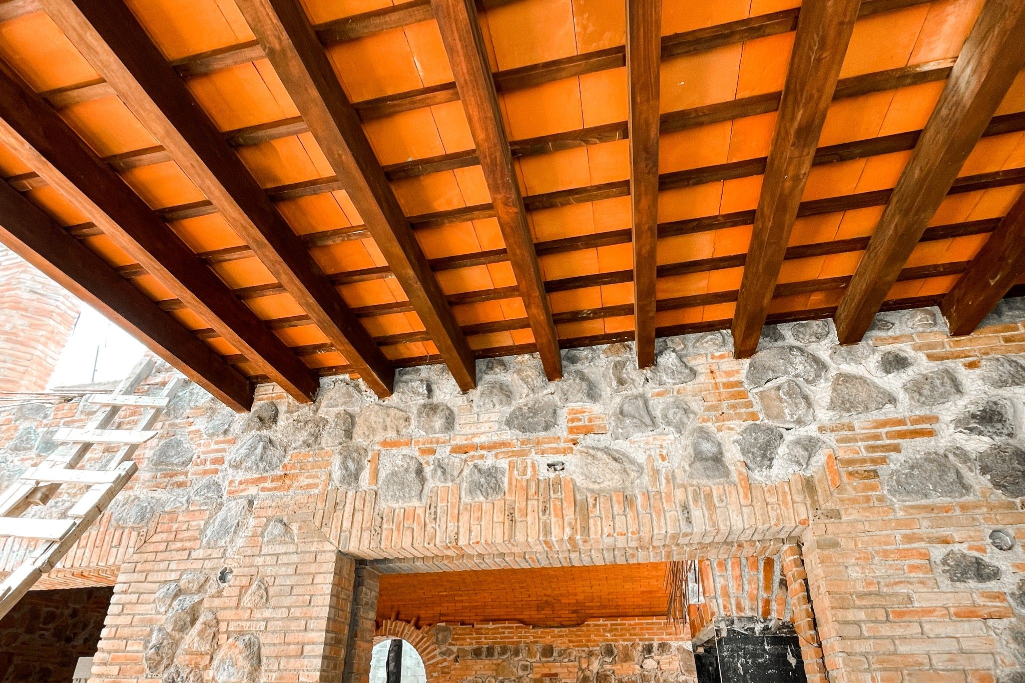 Spanish-style terrace corridor that connects the entry to the social area, which includes a guest bathroom, a central courtyard, a living–dining area, and a kitchen that opens onto the rear patio and a Spanish-style terrace pergola. The rear patio features a jacuzzi and a swimming pool integrated into an aqueduct ruin.