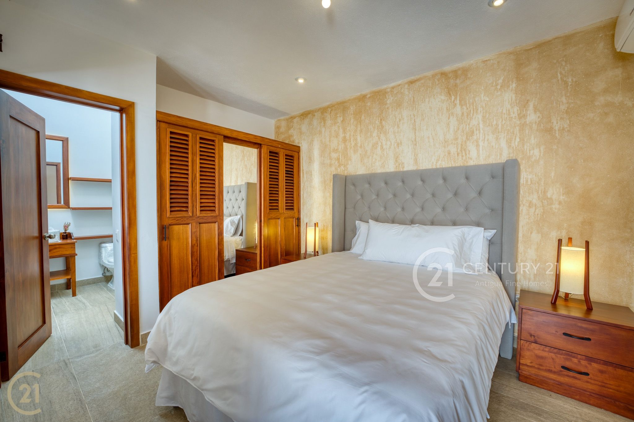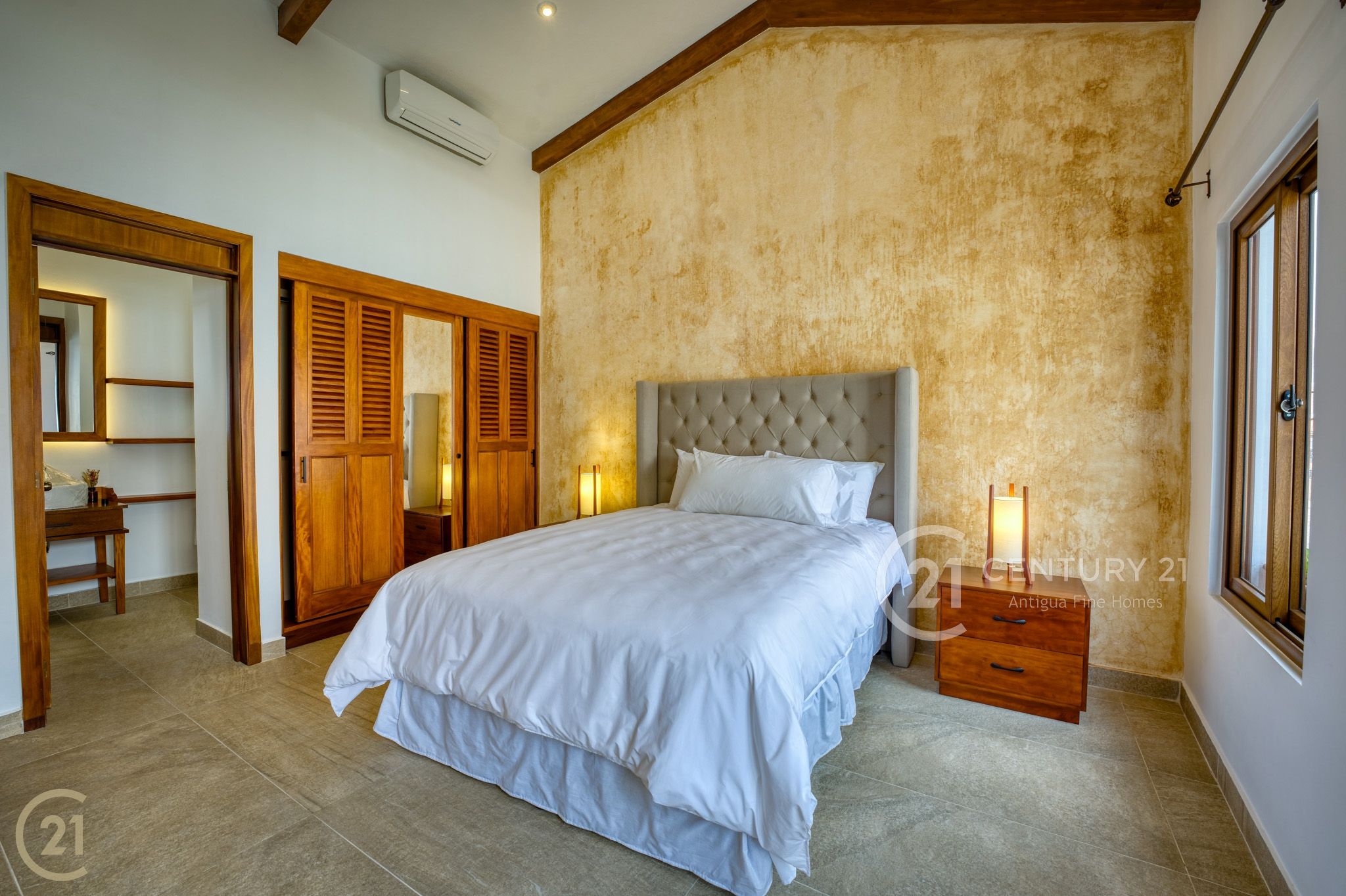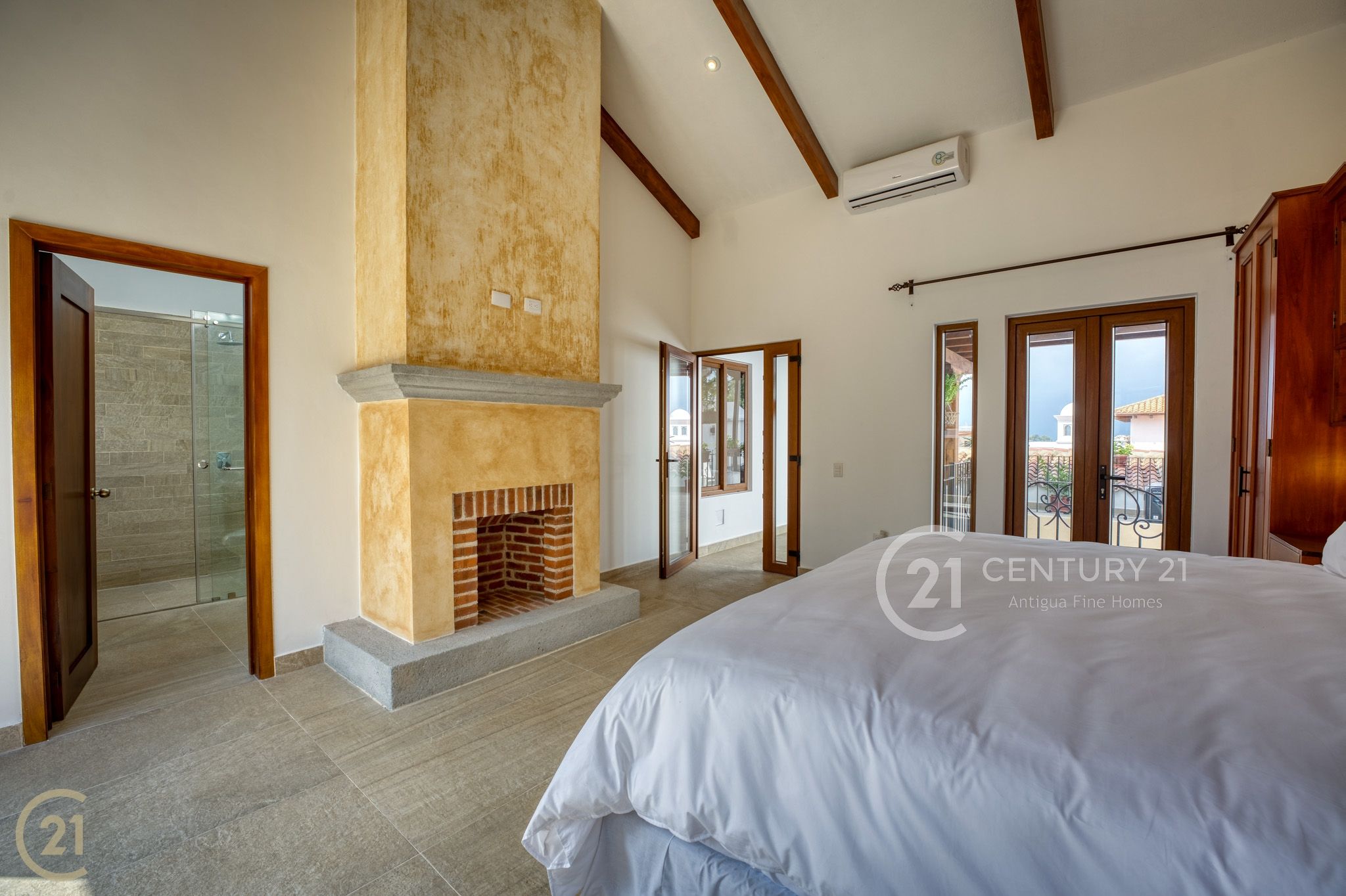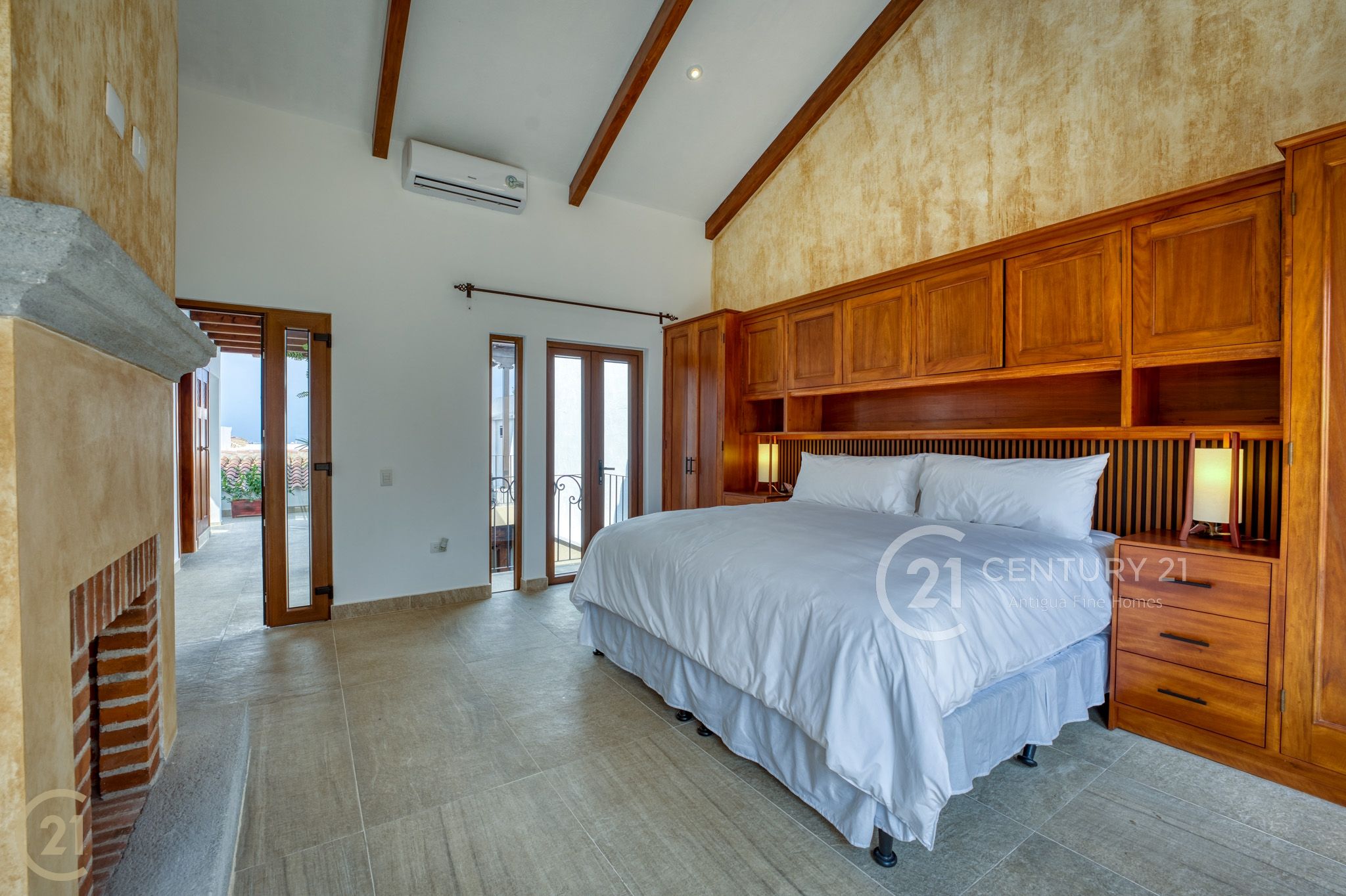 One bedroom includes a full bathroom and closet space, while the primary suite stands out with its fireplace, spacious bathroom, and abundant storage. Custom closet space is integrated into the headboard wall, and a charming Jack-and-Jill–style balcony overlooks the courtyard below, adding character and connection to the home’s interior spaces.