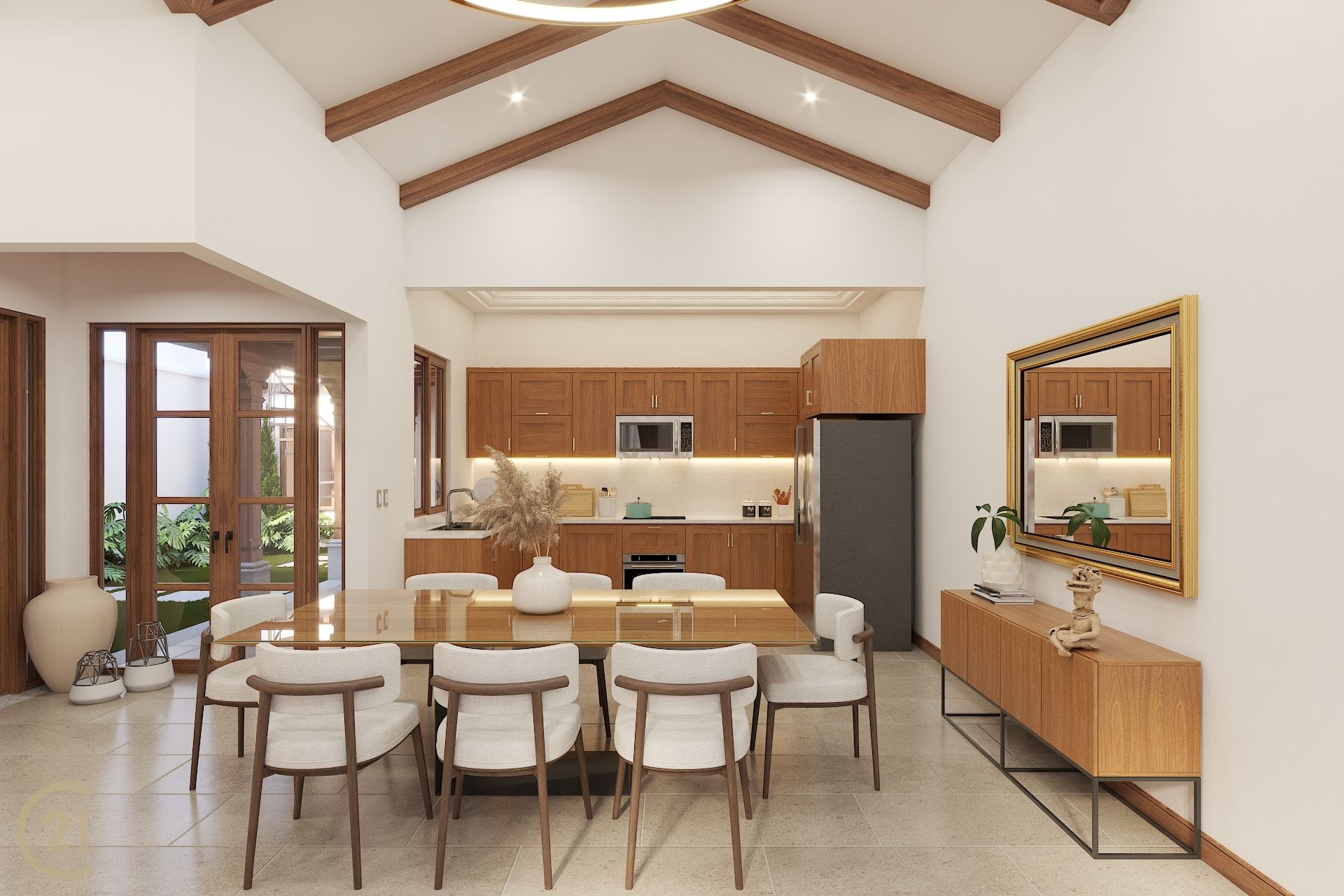 The dining area connects seamlessly with the garden, while the kitchen with cupula, adding both visual interest and natural illumination.