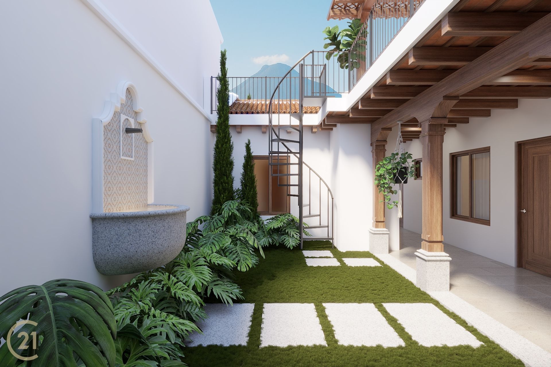 The home includes covered parking for one vehicle and is organized around a central interior garden, highlighted by a traditional búcaro fountain that fills the house with natural light and a sense of calm. The main living area is spacious and features a fireplace, creating an ideal setting for relaxation or entertaining guests.