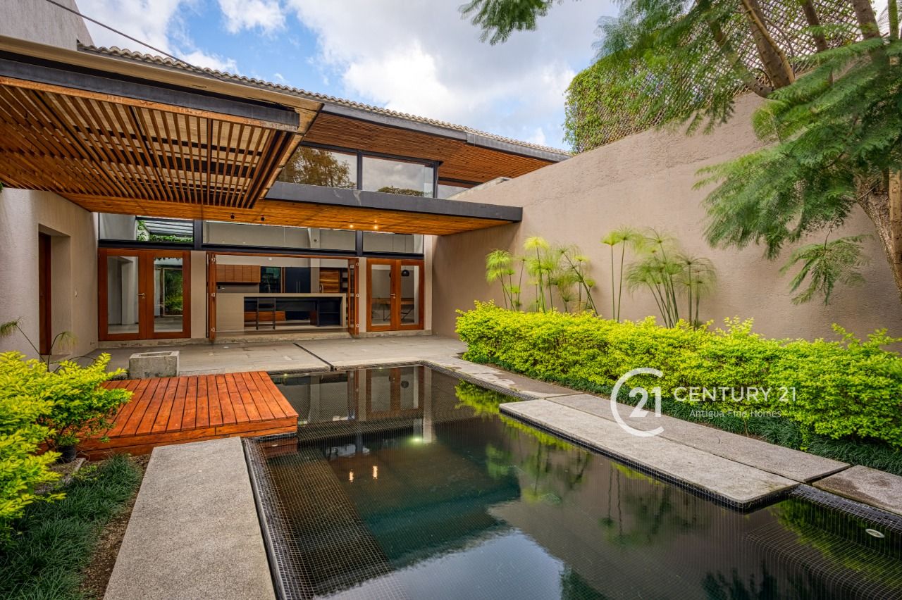 Las grandes puertas plegables de caoba con vidrio se abren completamente hacia el jardín, creando una transición perfecta entre los espacios interiores y exteriores. En el exterior encontrará un hermoso jardín privado con piscina, ideal para disfrutar del clima de Antigua, relajarse o compartir con familiares y amigos.