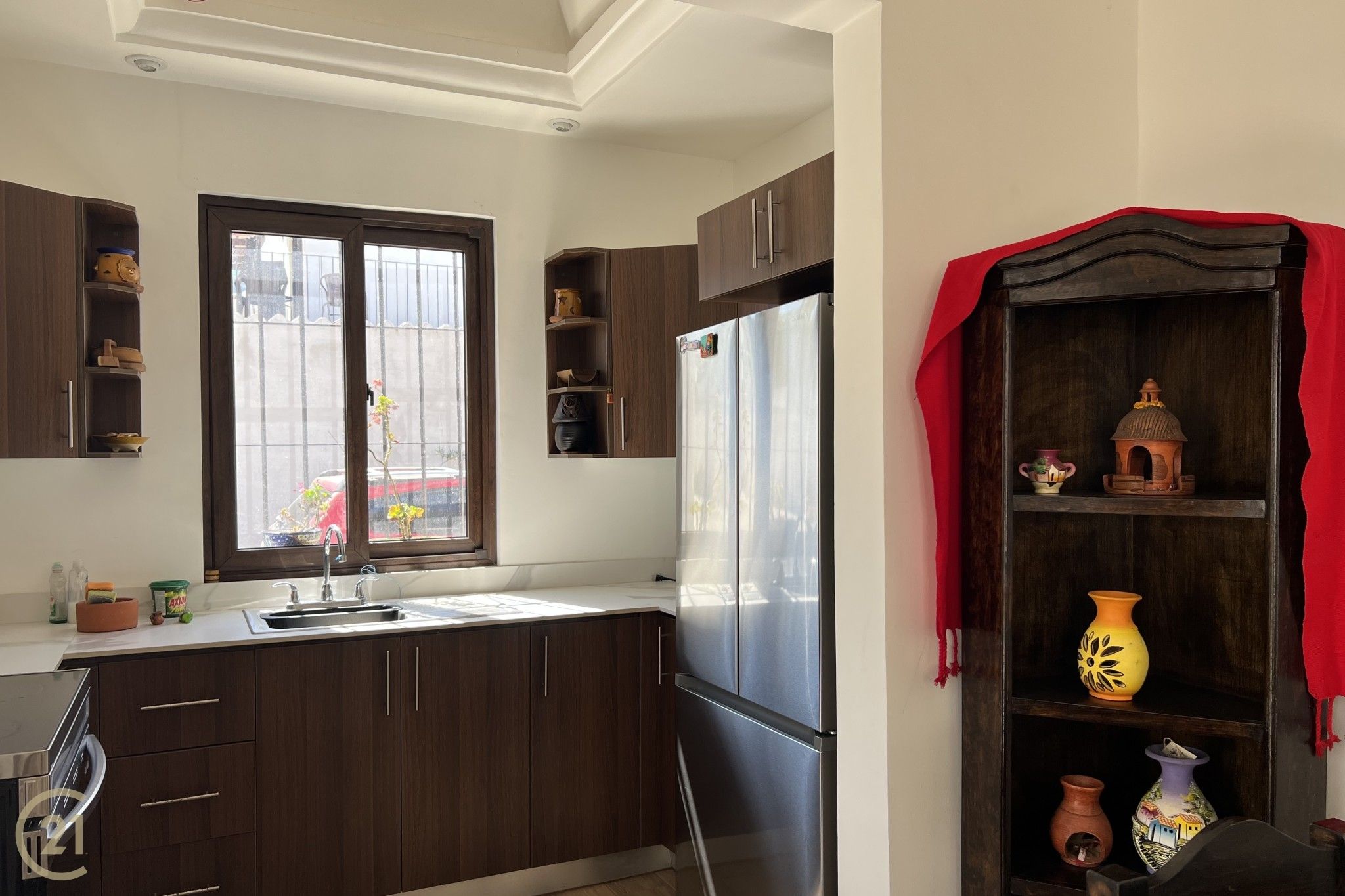 En el primer nivel se encuentran dos cómodas habitaciones que comparten un baño completo, perfectas para familiares o visitas. Además, dispone de un acogedor jardín interior con búcaro que aporta frescura y un toque tradicional al ambiente. La sala y el comedor se integran armoniosamente, creando un espacio ideal para convivir y compartir momentos especiales. La cocina, con una elegante cúpula, que permite una excelente entrada de luz y ventilación natural.